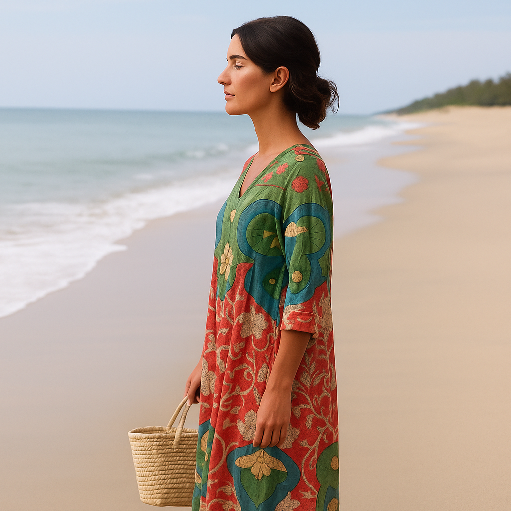 Este elegante vestido informal combina estampados vibrantes con una silueta relajada, lo que lo hace ideal tanto para paseos por la playa como para salidas cotidianas. Con su escote en V, mangas tres cuartos y falda fluida, equilibra la comodidad con un encanto llamativo.